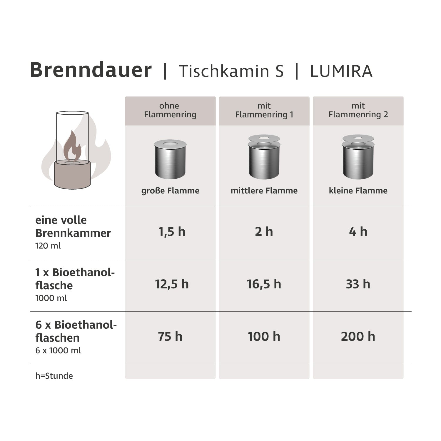 Eine vollständig gefüllte LUMIRA-Brennkammer (ca. 120 ml Bioethanol) brennt 1,5 bis 4 Stunden.