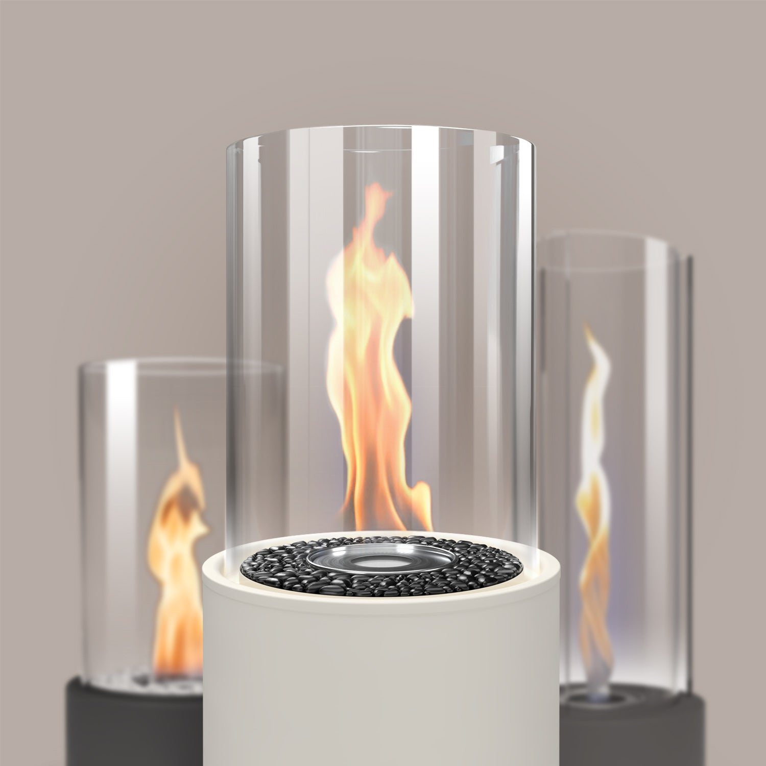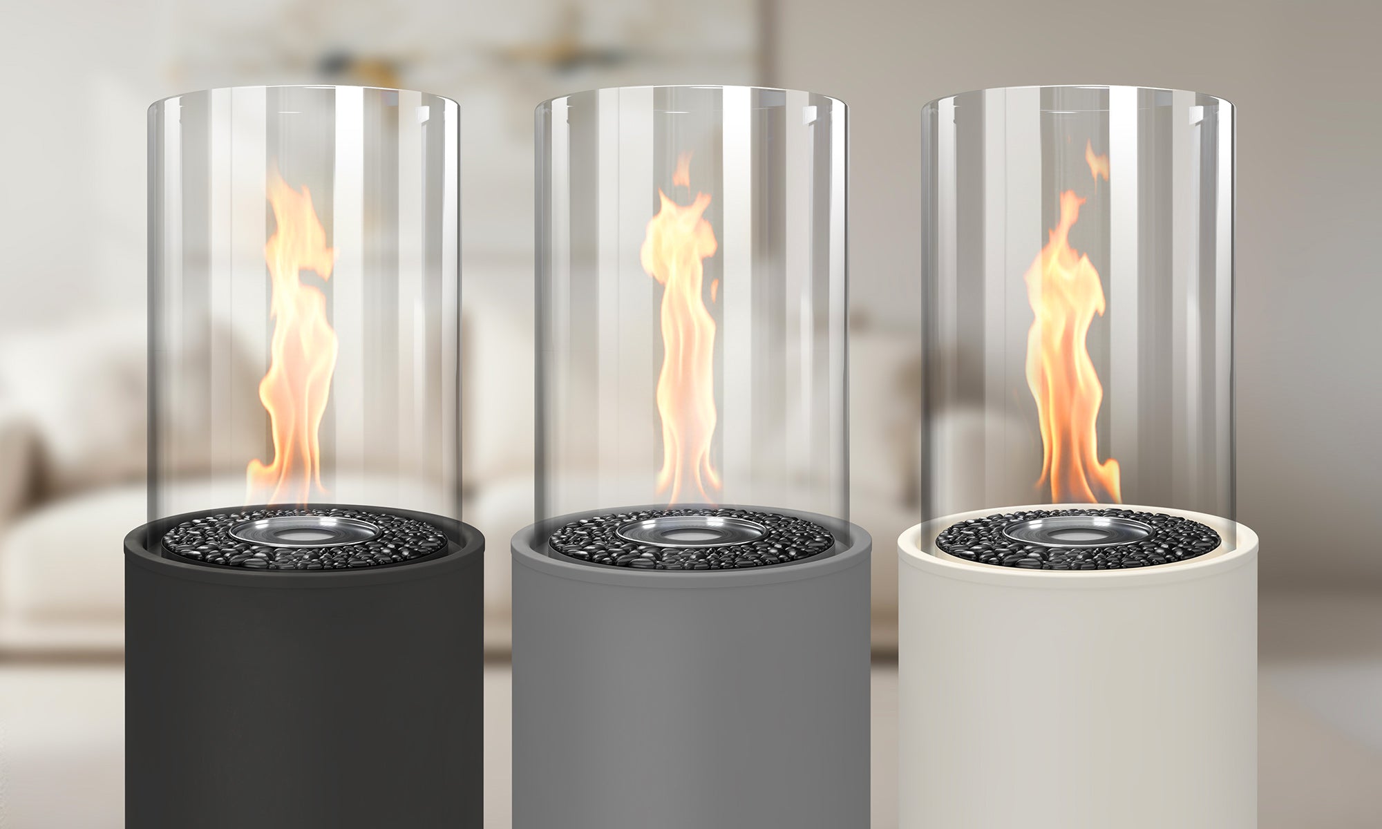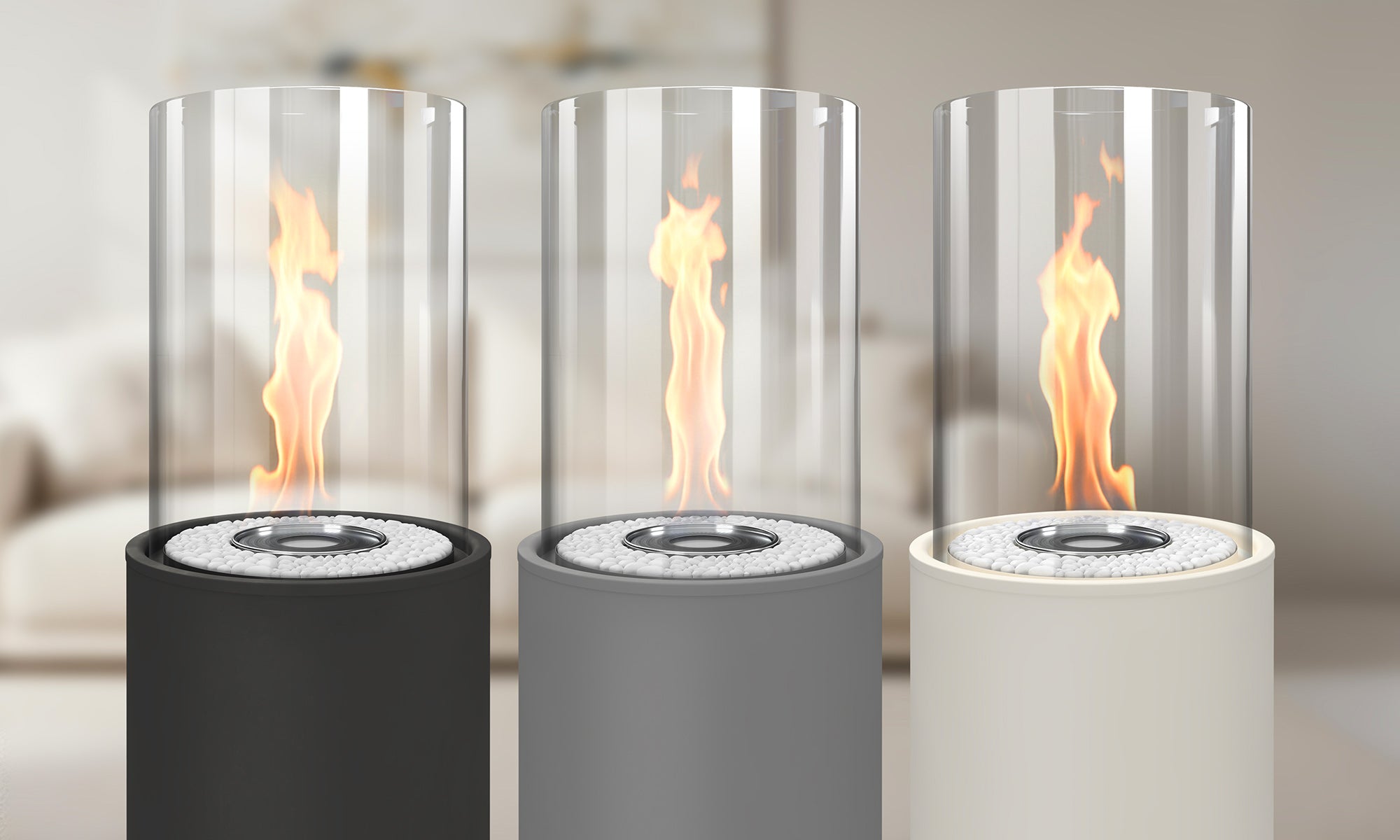 Unsere Kamine werden mit weißen oder schwarzen Steinen geliefert. Sie entscheiden, was am besten zu Ihrem Ambiente passt.