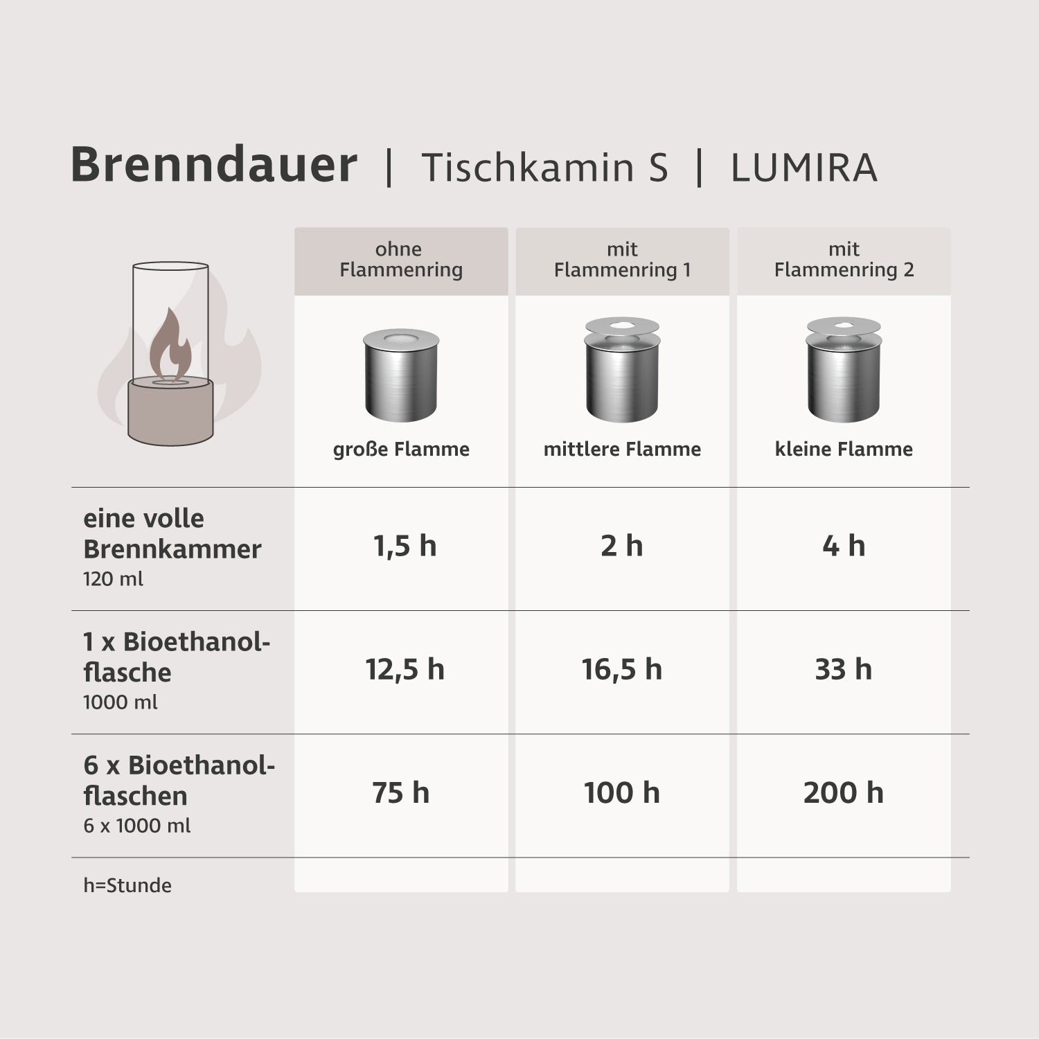 Eine vollständig gefüllte LUMIRA-Brennkammer (ca. 120 ml Bioethanol) brennt 1,5 bis 4 Stunden.