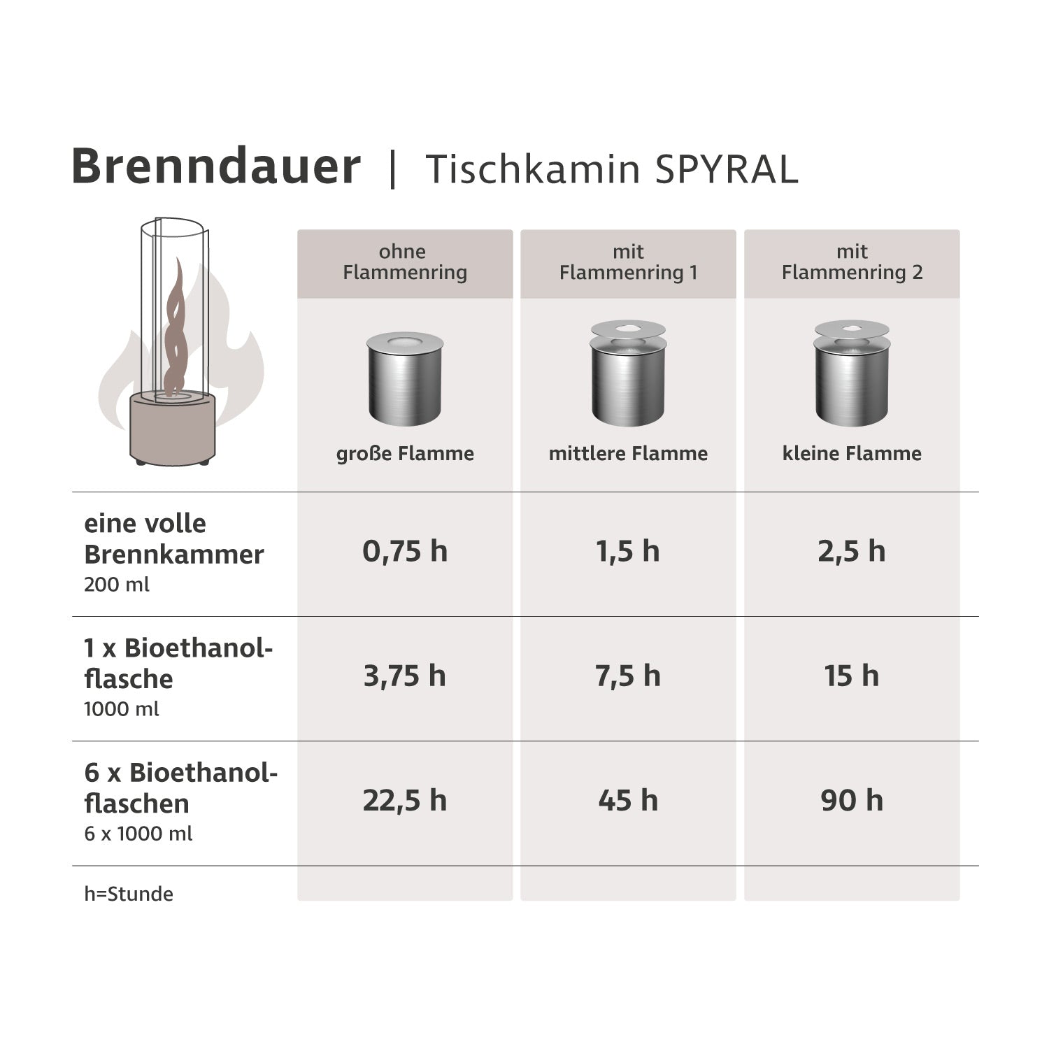 Eine vollständig gefüllte SPYRAL-Brennkammer (ca. 200 ml Bioethanol) brennt 0,75 bis 2,5 Stunden.