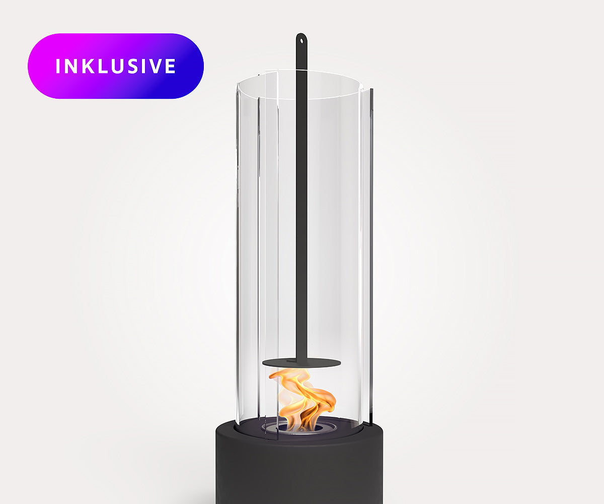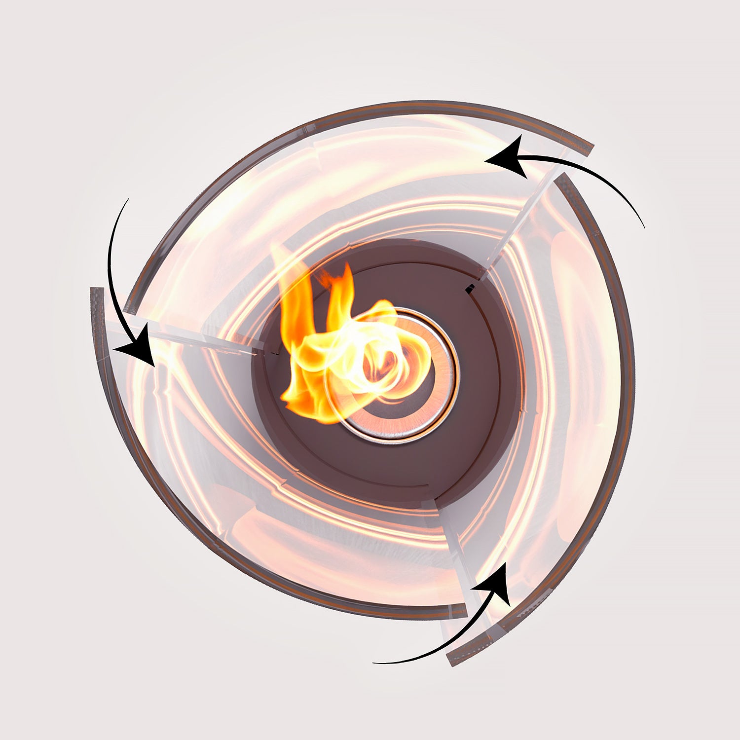 Die spezielle Konstruktion mit drei Glasscheiben ermöglicht eine gezielte Luftzufuhr zur Flamme im Inneren. Dadurch entsteht ein rotierender Tornado- bzw. Spiraleffekt, der die Flamme eindrucksvoll nach oben führt.
